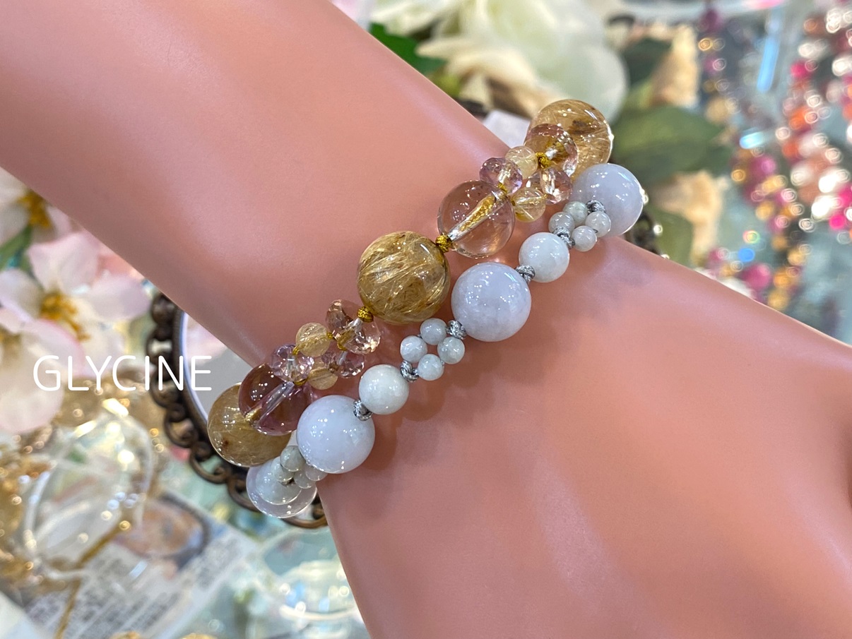 ルチルクォーツ、アメトリンの2種類の天然石でデザインしたパワーストーンブレスレットとの重ね着けコーデ写真です。