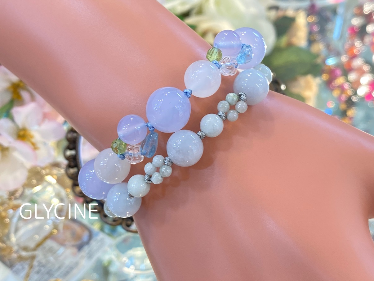 ブルーカルセドニーとムーンストーン、アクアマリン、ペリドット、水晶の5種類の天然石でデザインしたパワーストーンブレスレットとの重ね着けコーデ写真です。