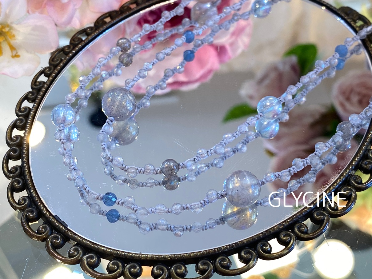 一番小さな小粒のラブラドライトを明るいシルバーカラーの紐で1粒1粒編んで、他の2種類の大きさのラブラドライトやアクアマリンを散りばめて