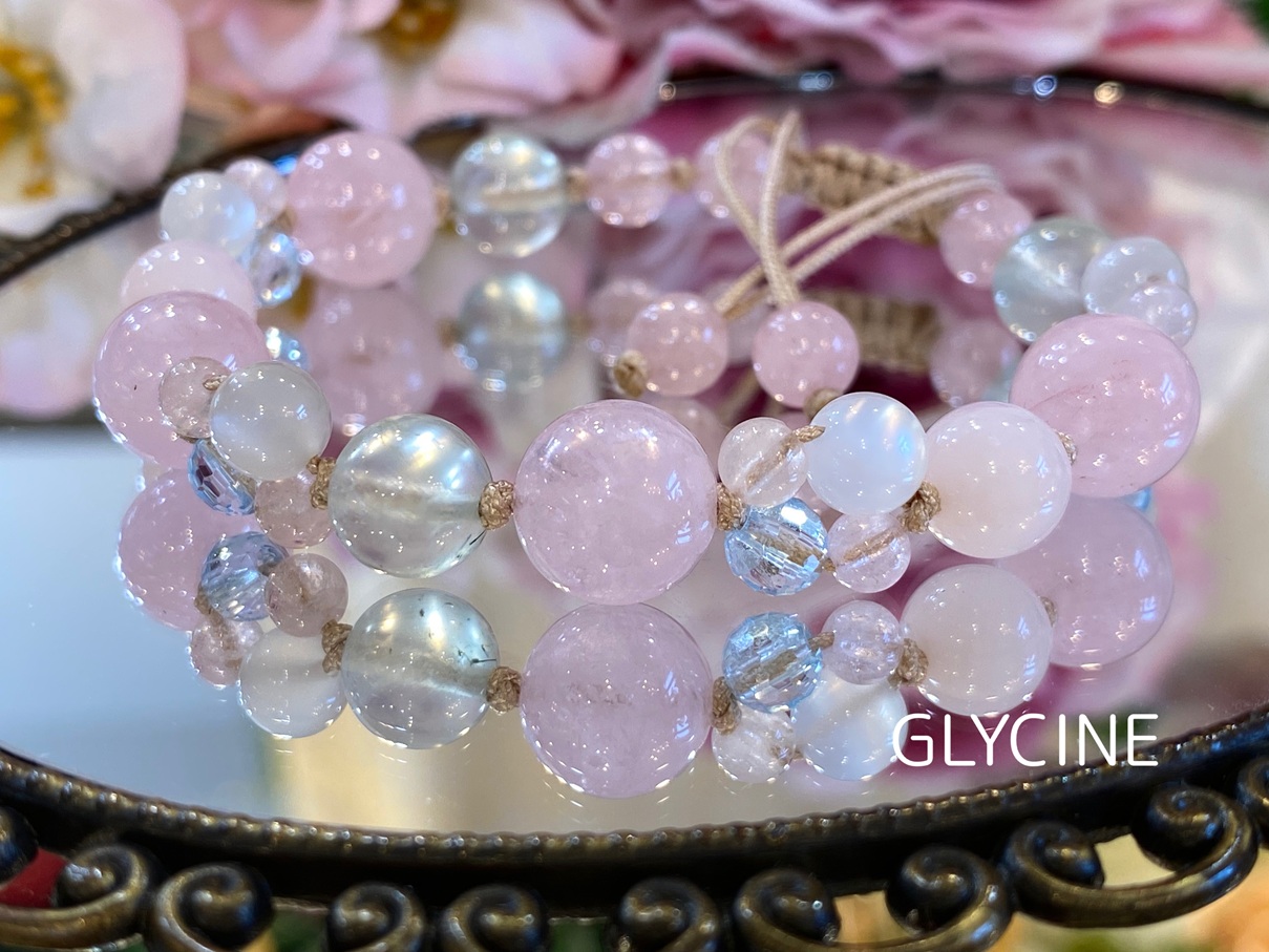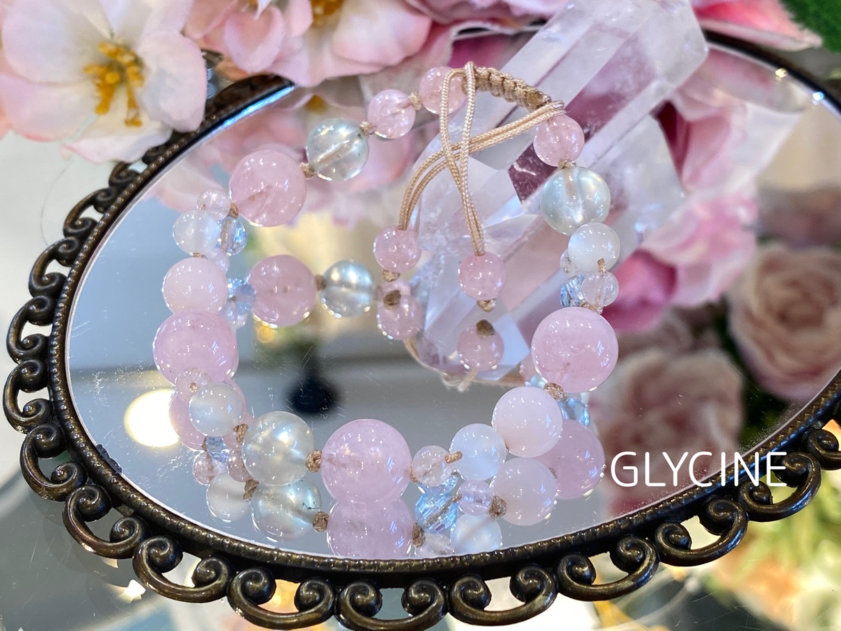 モルガナイト、ムーンストーン、ブルートパーズの四つ葉編を飾ったカラフルなお色パターンと