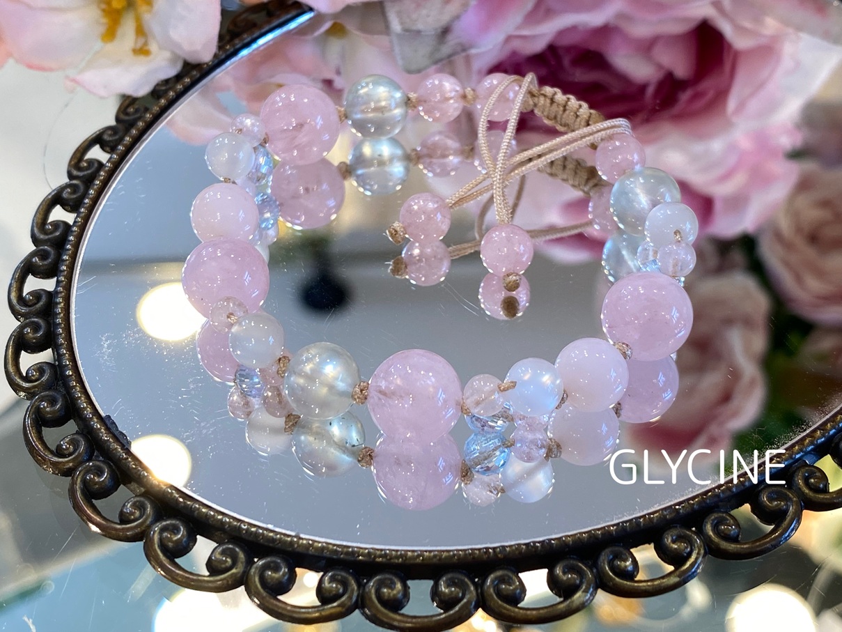 モルガナイト、ムーンストーン、ブルートパーズの四つ葉編を飾ったピンク色パターンの
