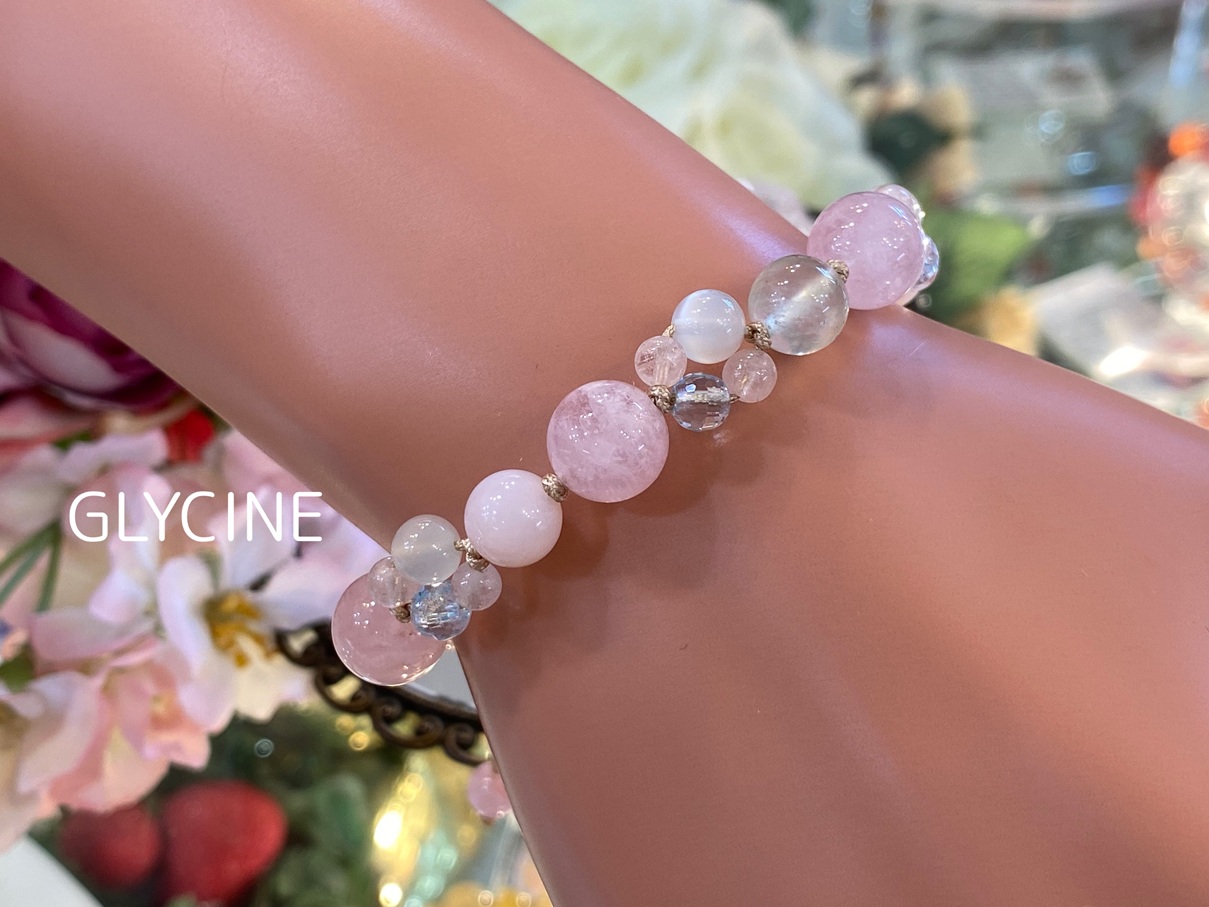 モルガナイト、ピンクオパール、プレナイト、ムーンストーン、ブルートパーズの5種類の天然石でデザインしたパワーストーンブレスレットです。