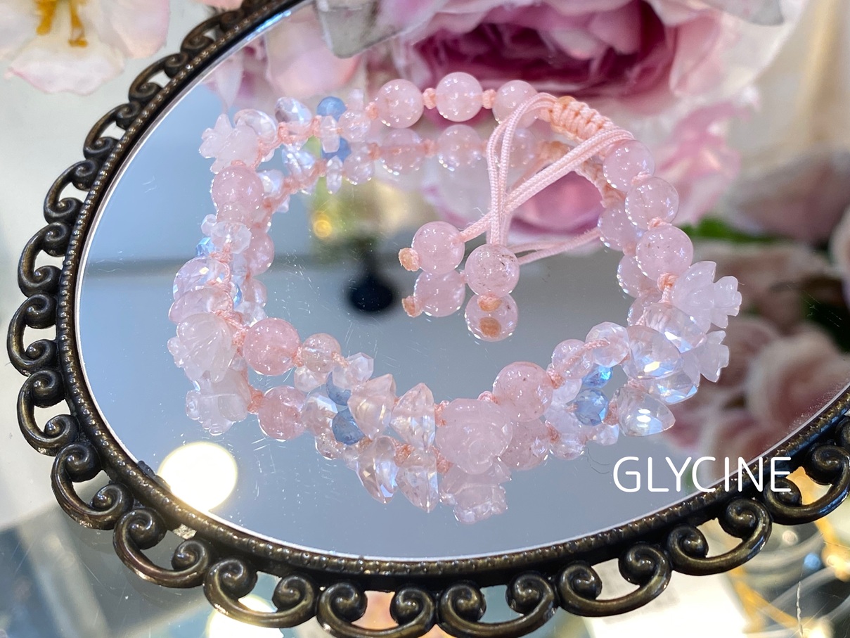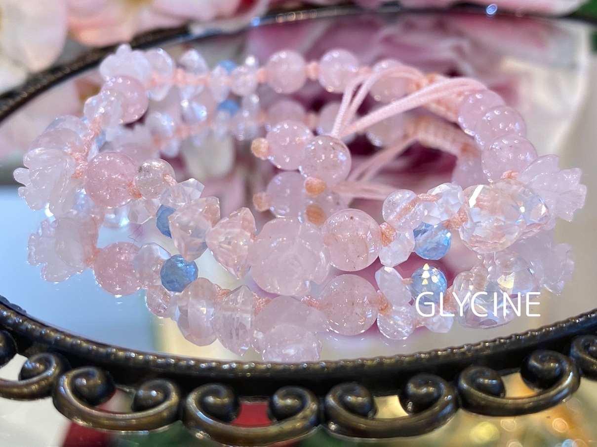 モルガナイト、ローズクォーツ、アクアマリンの3種類の天然石でデザインしたパワーストーンブレスレットです♪