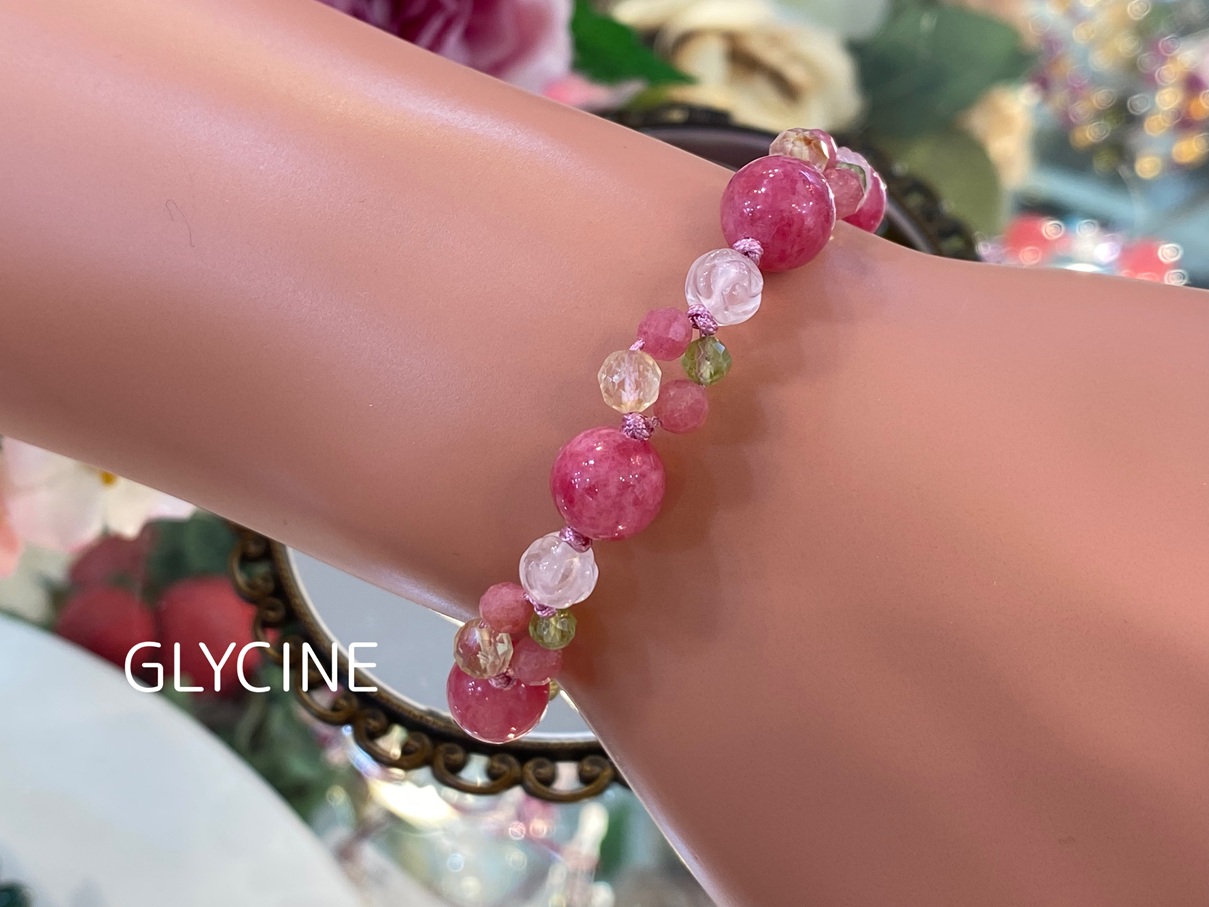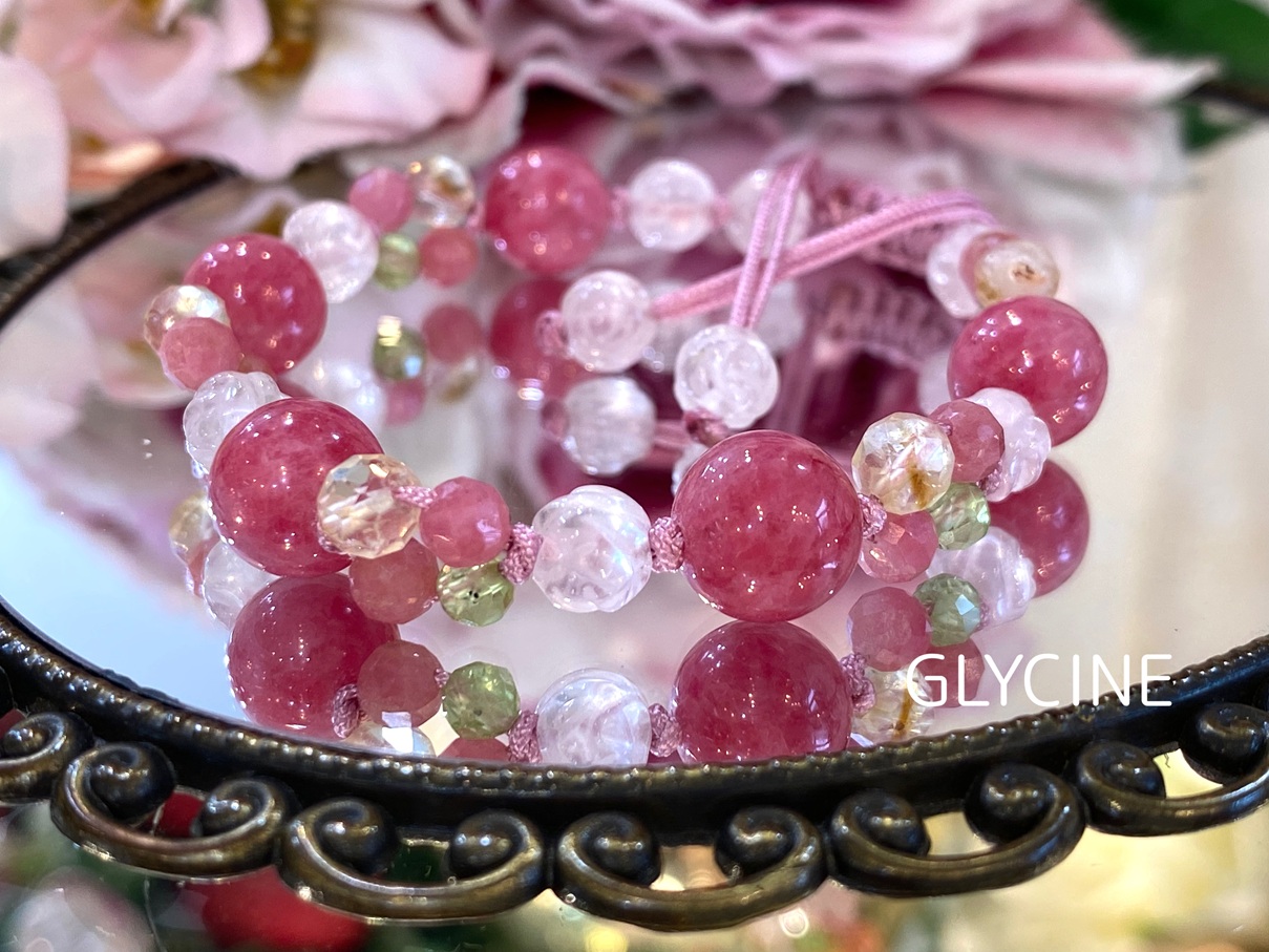ロードナイト、ローズクォーツ、ペリドット、シトリンの4種類の天然石でデザインしたパワーストーンブレスレットです♪