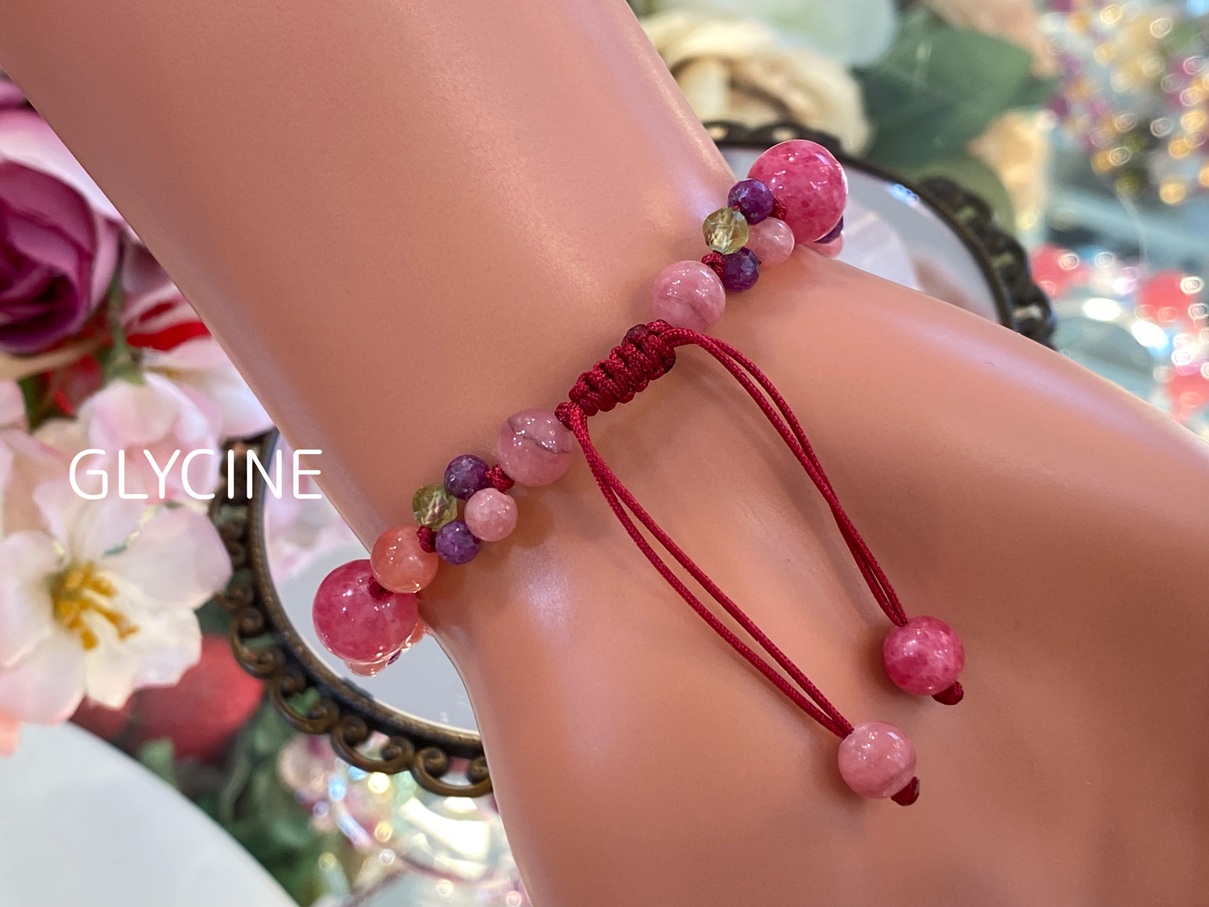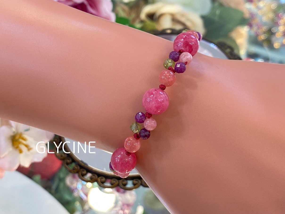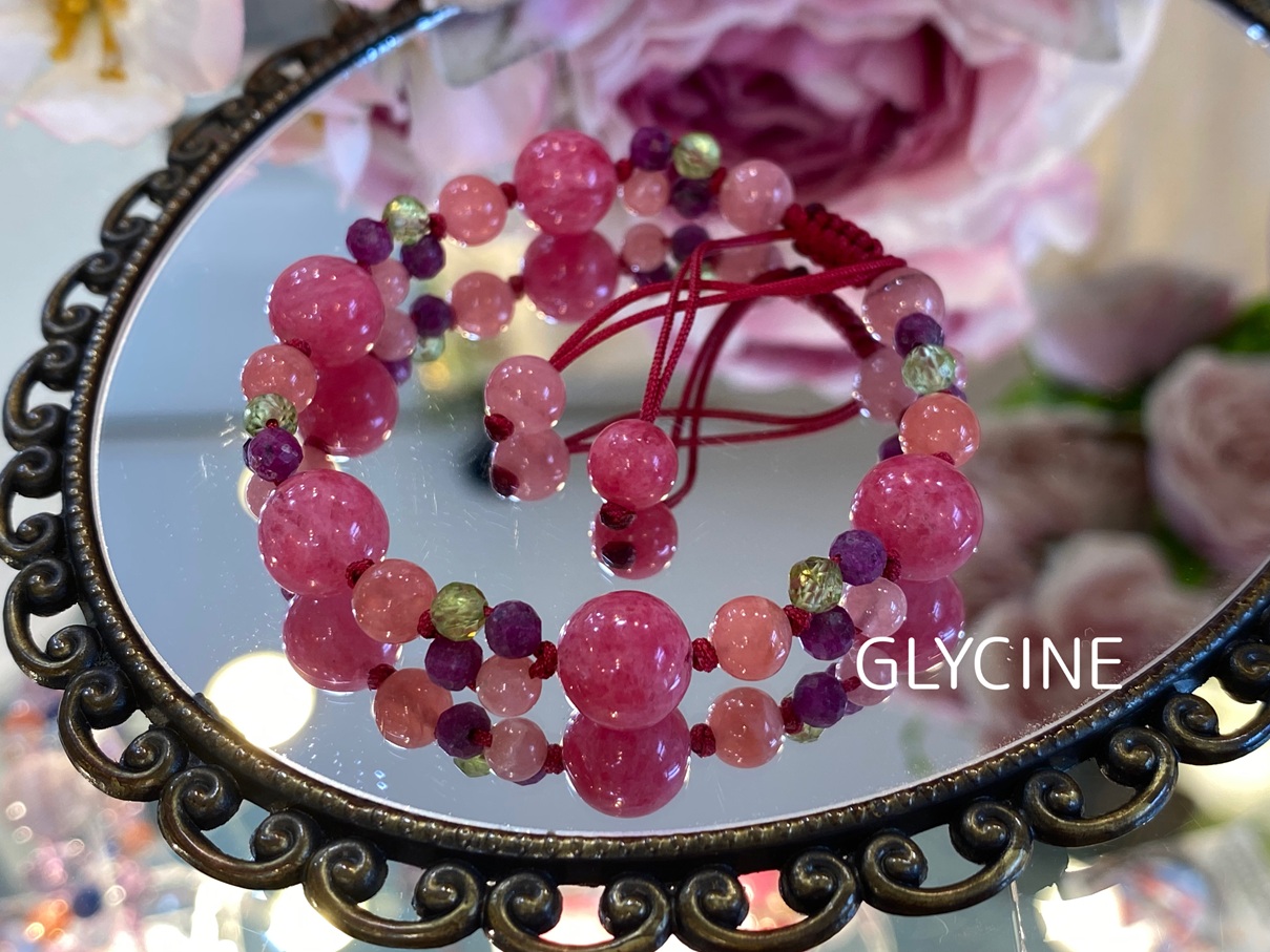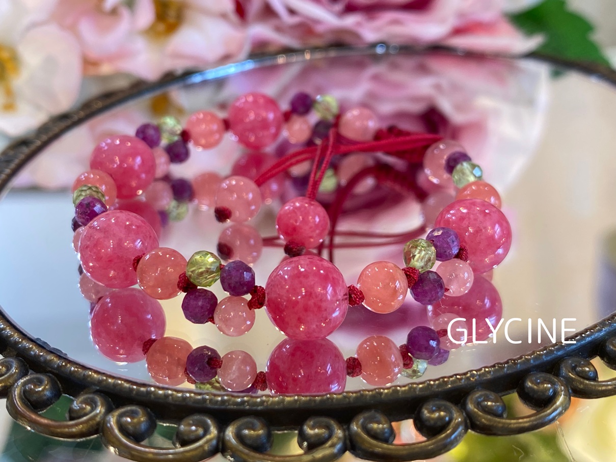 ロードナイト、ルビー、ロードクロサイト(インカローズ)ペリドットの4種類の天然石でデザインしたパワーストーンブレスレットです♪