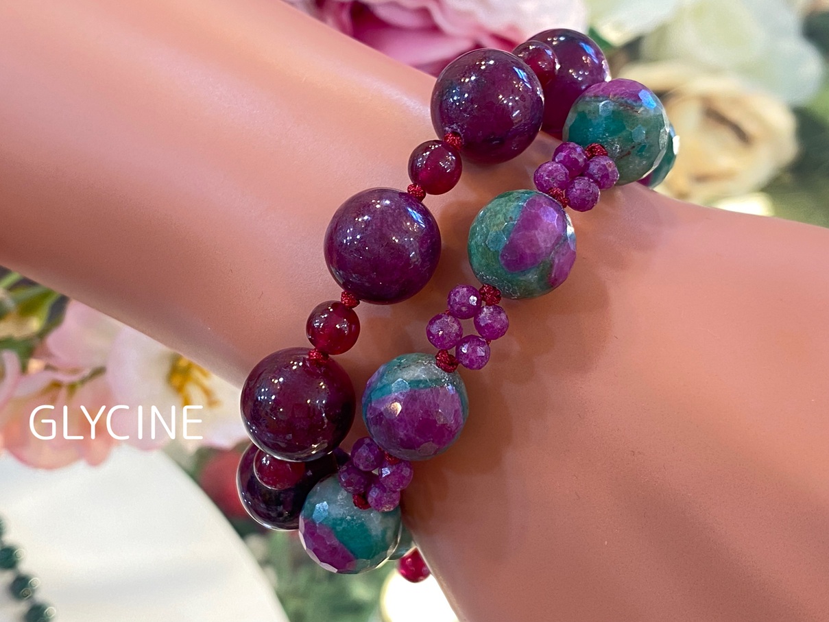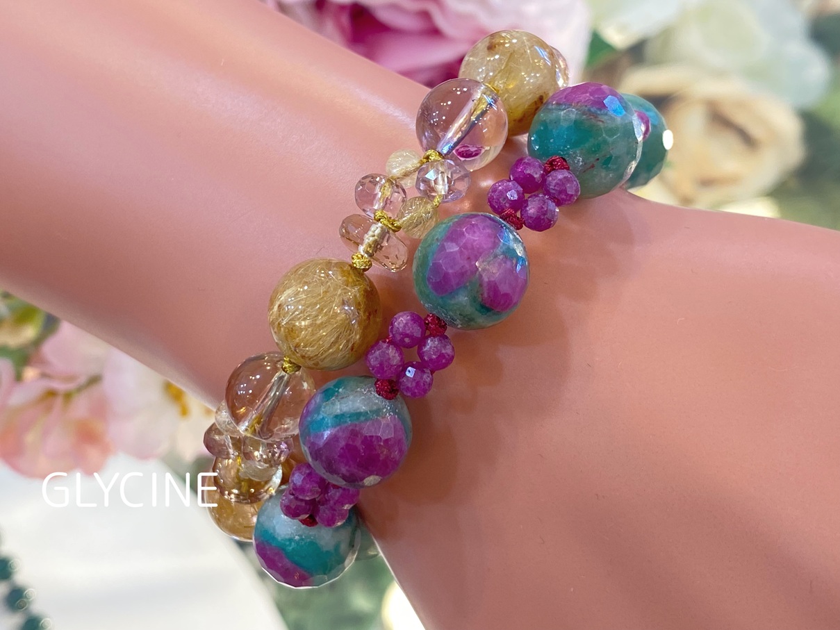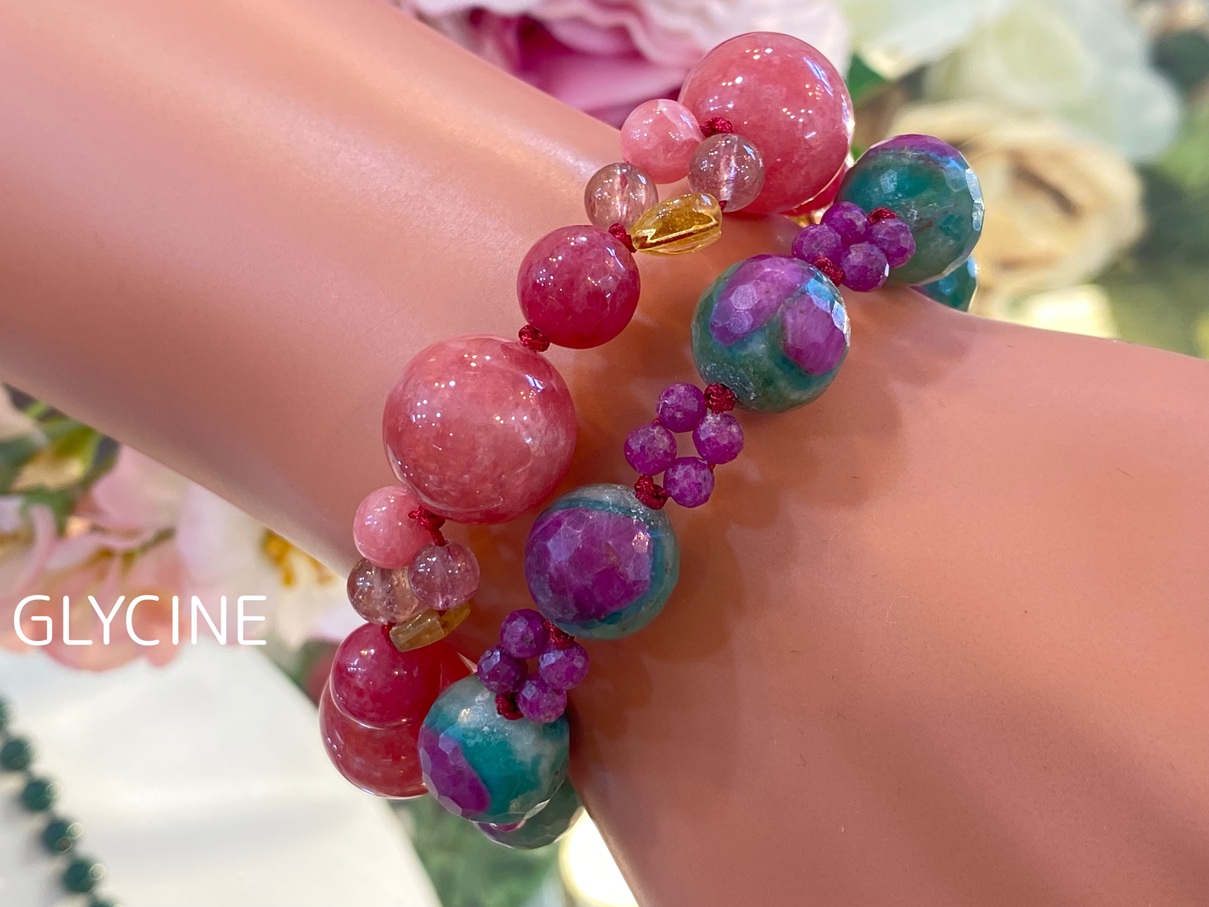 ルビーインゾイサイトとルビーの2種類の天然石でデザインした新作のパワーストーンブレスレットとの重ね着けコーデ写真です。(ルビーがたっぷり過ぎるルビーインゾイサイトの間にルビーを挟んだシンプルなデザインのパワーストーンブレスレットは開催中の9周年感謝セール割引対象です)