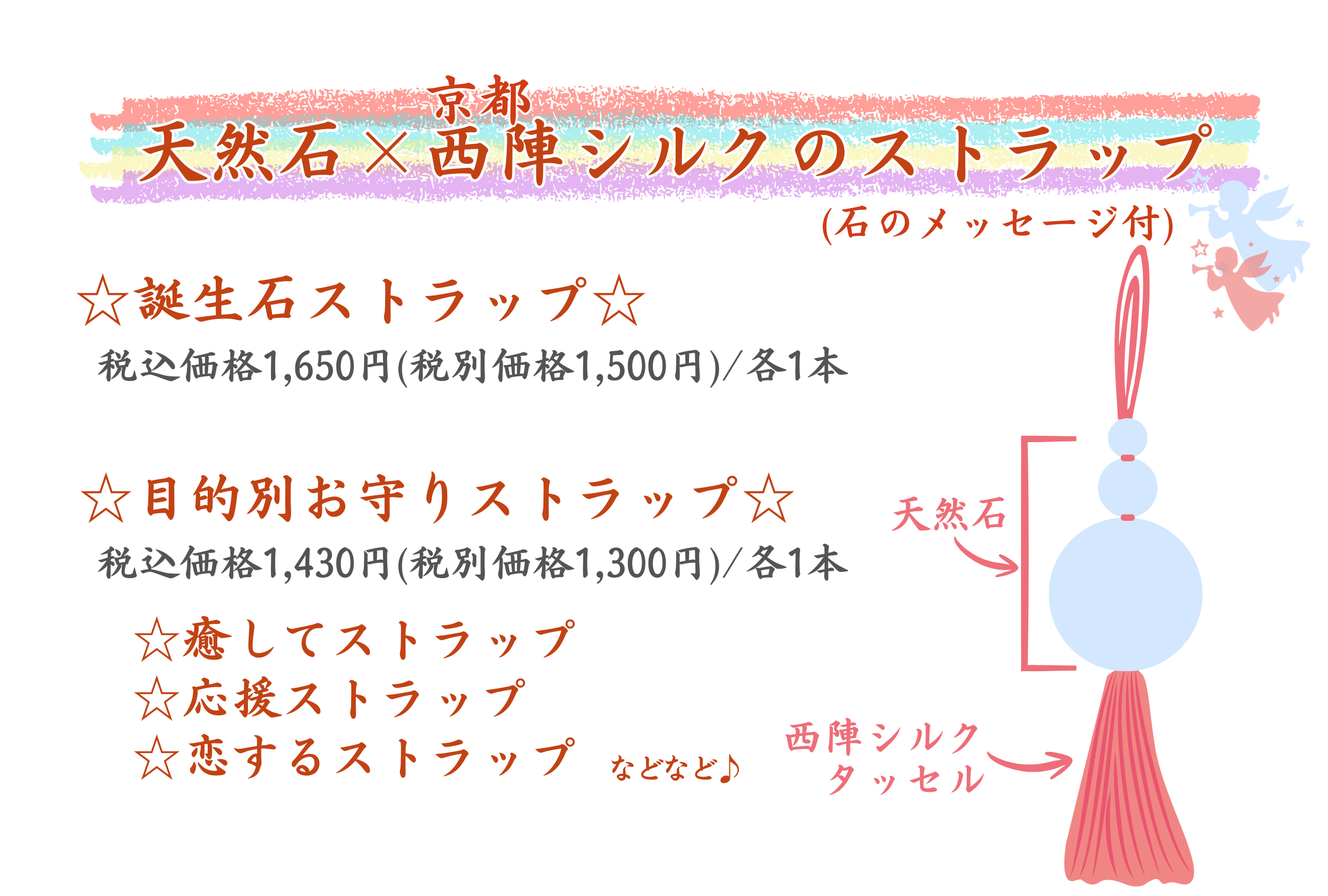 誕生石と水晶に、西陣シルクのタッセルを付けたストラップ。