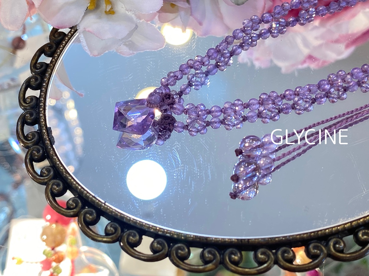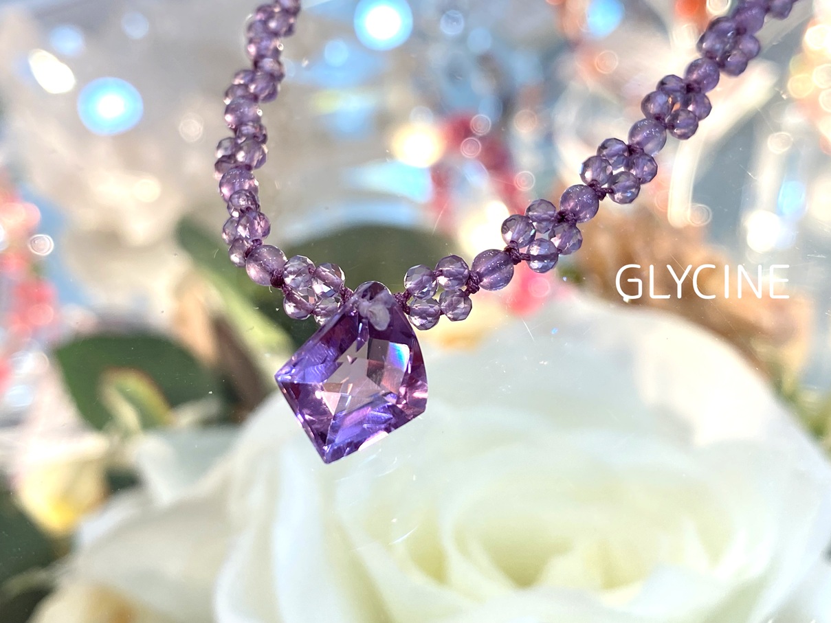 超小粒のアメジストにカットが施された丸玉の四つ葉編、