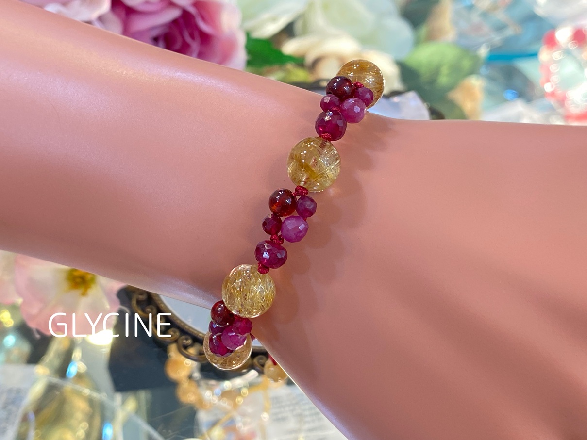 ルチルクォーツ、ルビー、ガーネット、ピンクトルマリンの4種類の天然石でデザインしています( *´艸`)