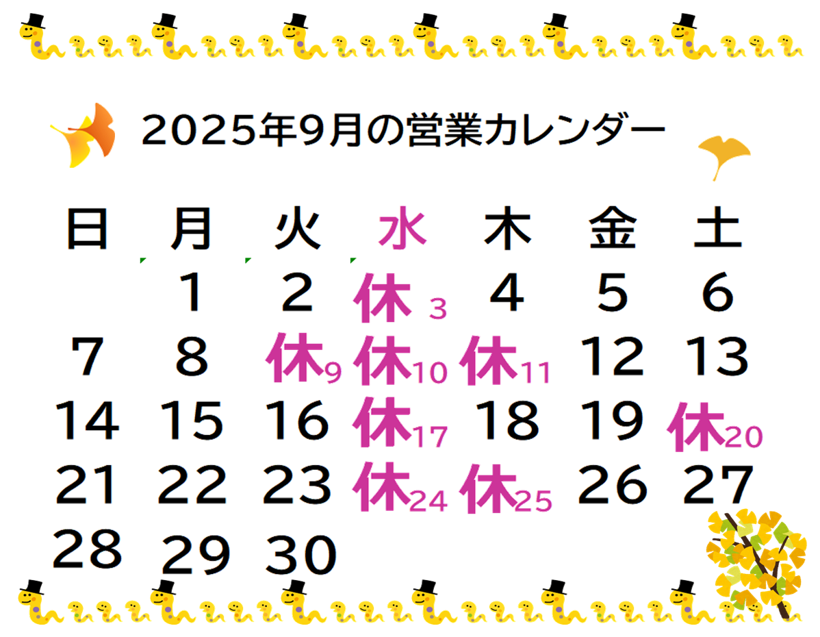 9月は定休日(水曜日)の他に、臨時休業日がございます。